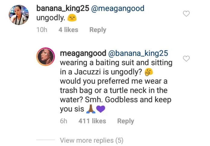 American actress, Meagan Good, was called ‘ungodly’ for taking a picture with bikini while in the Jacuzzi and she has responded to the person.