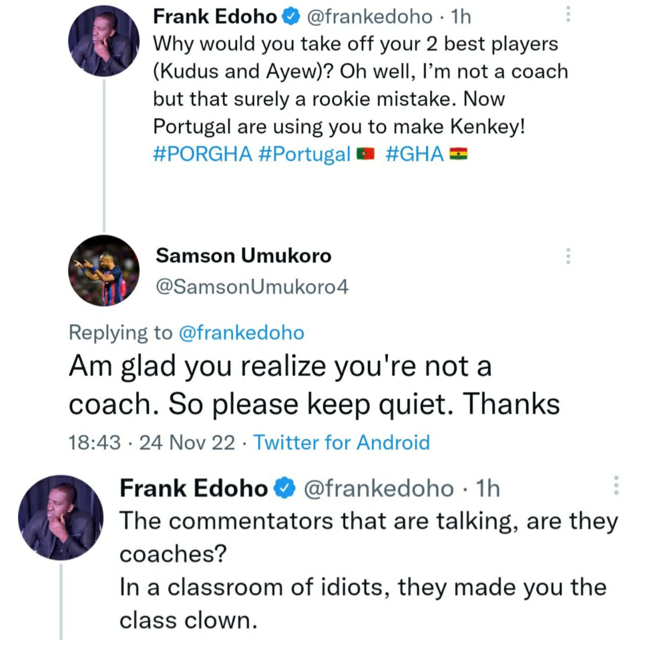 A Twitter user has clashed with media personality, Frank Edoho following Ghana’s loss to Portugal in yesterday’s World Cup game.