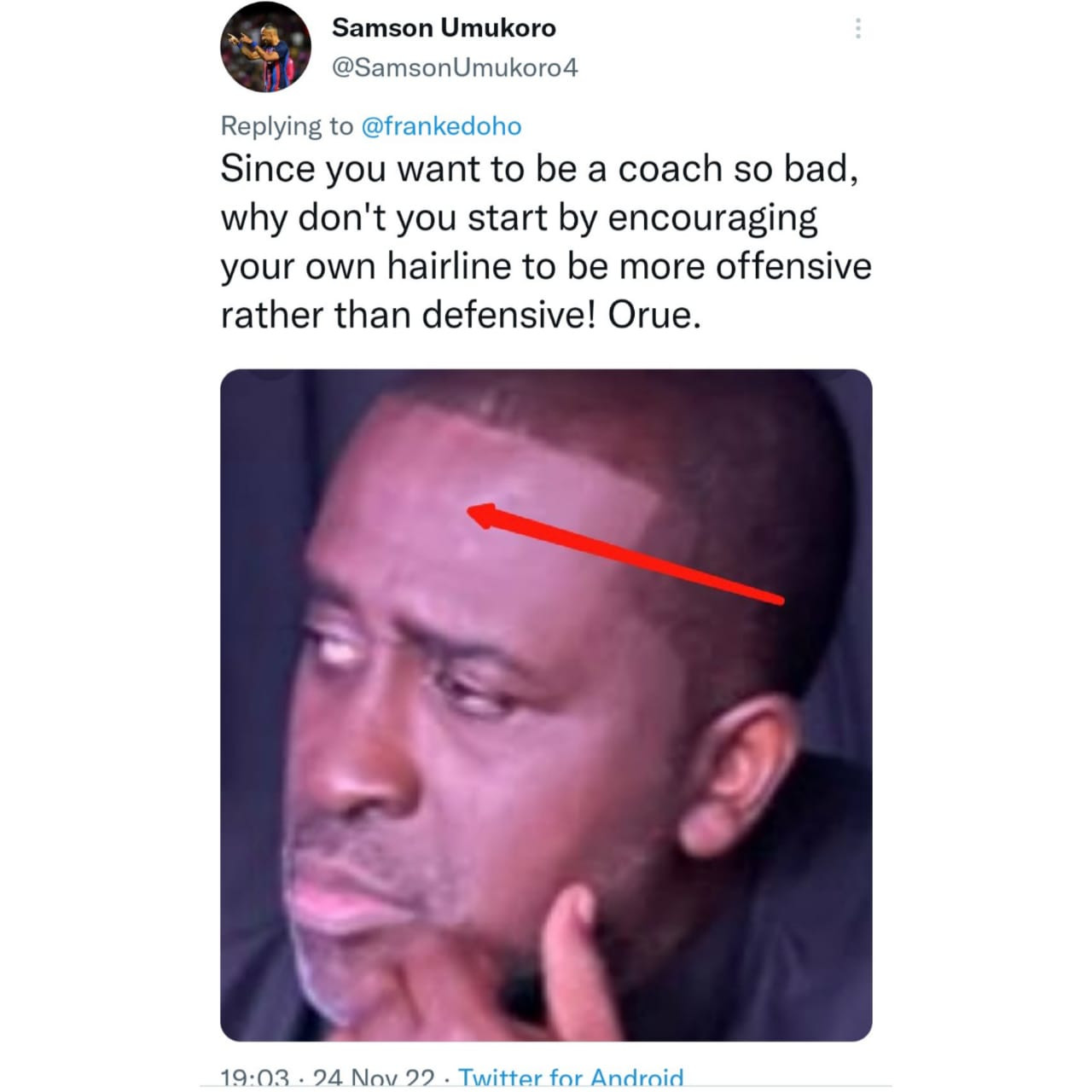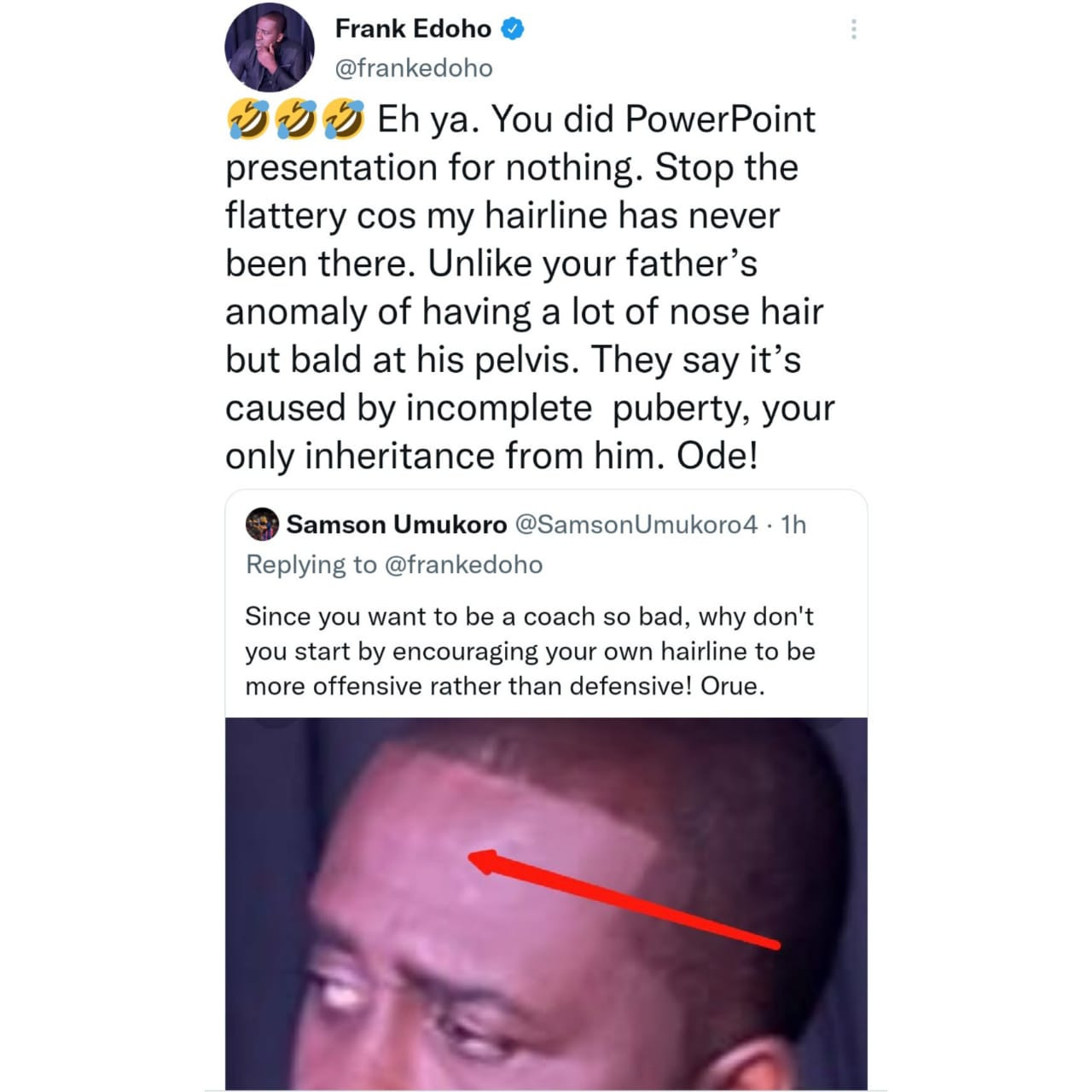 The Twitter user also made mockery of Edoho’s hairline.