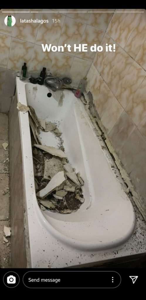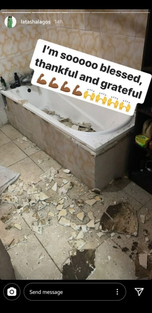 In a video she shared on her Instastories, she revealed that her ceiling caved into her bathroom just as she was about to take a bath in the same place.