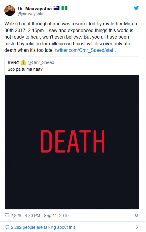 A medical doctor has shared the shocking experience of how he died and was resurrected by his dad. The doctor, known on Twitter as Dr Maxvayshia, gave vivid details of how he fell sick, knew he was dying and called his family members to come around on March 30, 2017. While making his last statement, he felt his soul being sucked out of his body, he said. Then he told of transitioning to another world and gave details of what it’s like on the other side. He also told of what it was like when he was told on the other side that it isn’t his time yet and his soul soared back to his body. When he returned, he said he had been “brain dead” for 45 minutes and had to be placed on brain drugs for a while. He also said he had to learn to use his body again and to recollect faces and names. He began his narration, saying: “I saw and experienced things this world is not ready to hear, won’t even believe. But you all have been misled by religion for millenia and most will discover only after death when it’s too late.” He ended by saying, “Anyone who tells you there is no life after death has sure deceived you and u either realise it now or later.” Twitter users were a bit confused after reading his entire thread. Some find it hard to believe. Some say he was hallucinating, while some are more interested in knowing if there really is a hell or not. Follow his tweet below to read the story: