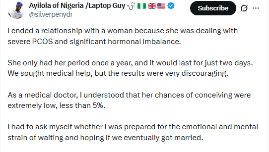 In a post shared on X, Dr Ayilola mentioned that his ex at the time was battling with PCOS and hormonal imbalance that caused her to see her menstrual flow only once in a year and the cycle lasts for only two days. He said that as a medical doctor, he knew that her chances of getting pregnant was slim and as someone who wouldn’t want to deal with infertility issues in future, he had a long discussion with her where he disclosed that he was no longer be interested in their relationship.