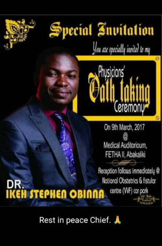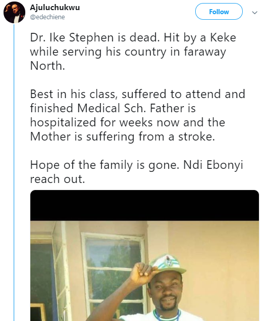 Dr. Ike Stephen was undergoing the mandatory one year National Youth Service in northern Nigerian when he was involved in a fatal accident involving a commercial tricycle, popularly known as keke napep.