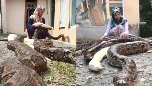 Dogs, cats, birds and the likes are the common animals you would most likely find people around you keeping as a pet but a 14-year-old Indonesian girl has six giant pythons that she loves to pet and cuddle with in her videos.