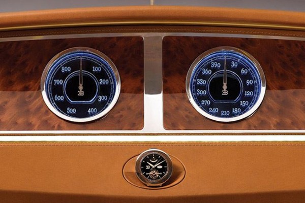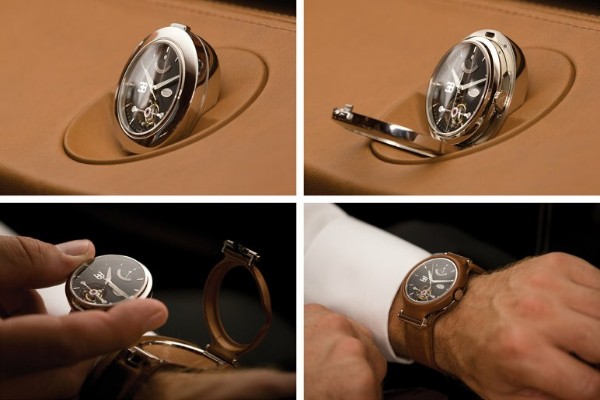 The interior of the sedan features an analog timepiece which can be mounted in the dash as a clock or on a wristband as a watch.