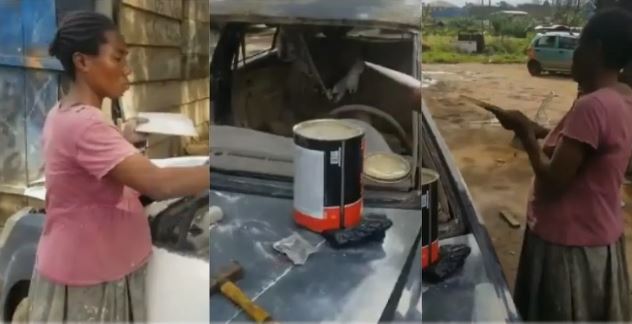 The technician is thriving in a male-dominated field. The highly-skilled woman, who works as an auto body repair and spraying technician at Nkwakwa in the Eastern Region of Ghana, has been videoed carrying out her daily routine at a workshop.