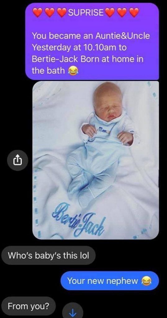 They visited Chelsea’s sister Holly and mum Gaynor and sent texts to her sisters with a picture of Bertie.