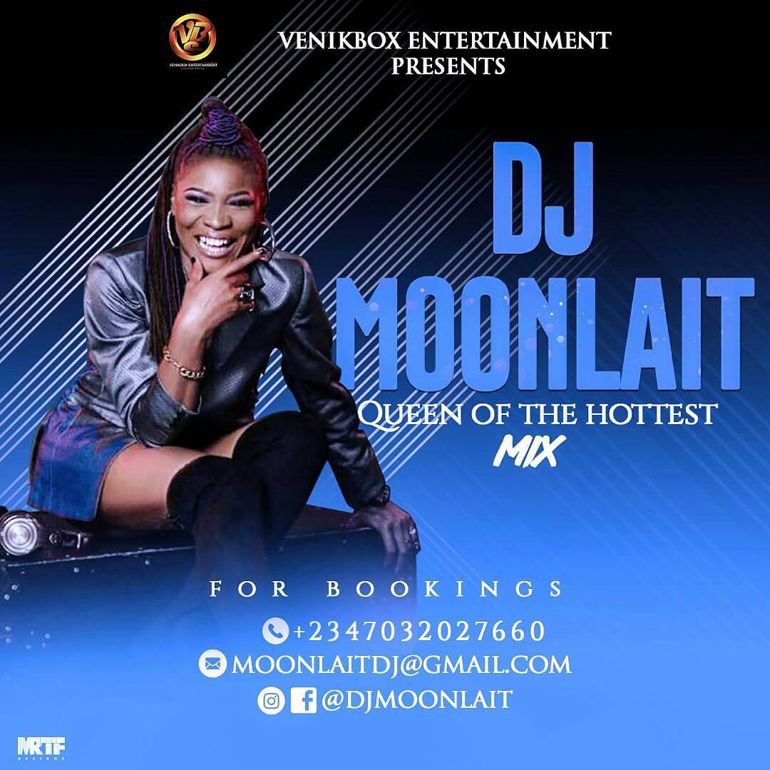 The fastest rising female Nigeria DJ. “Moonlait” started her professional disc jockey career in 2012 and has been a real force to reckon with ever since. Moonlait’s Open-format DJ style and unlimited genre catalogue takes audiences on an exuberant journey.