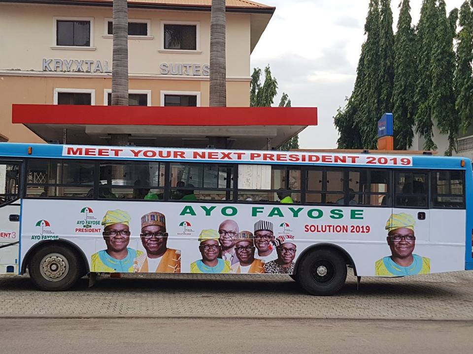 These are some of the branded buses of the Ekiti State Governor, Ayo Fayose as seen in the streets of Abuja. He officially declares his presidential ambition today in Abuja.