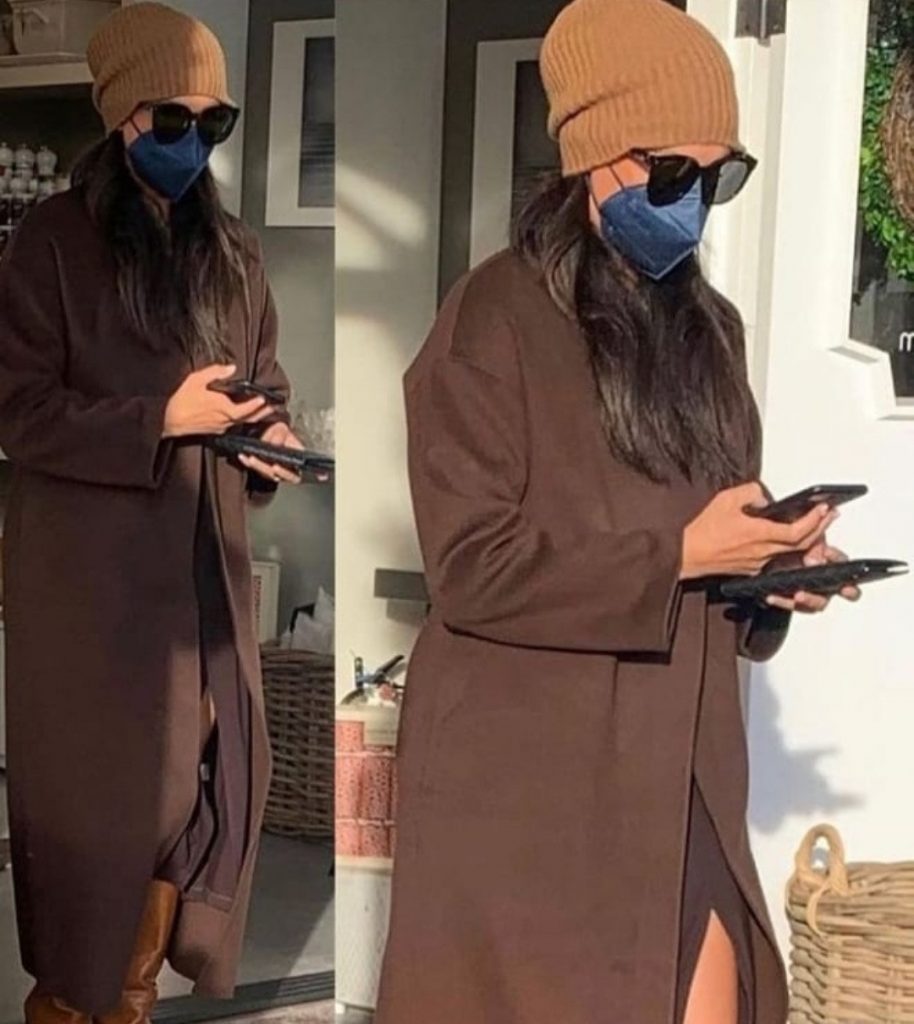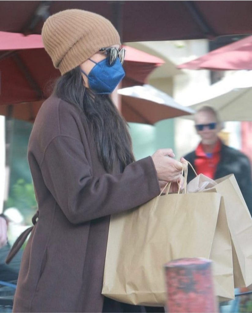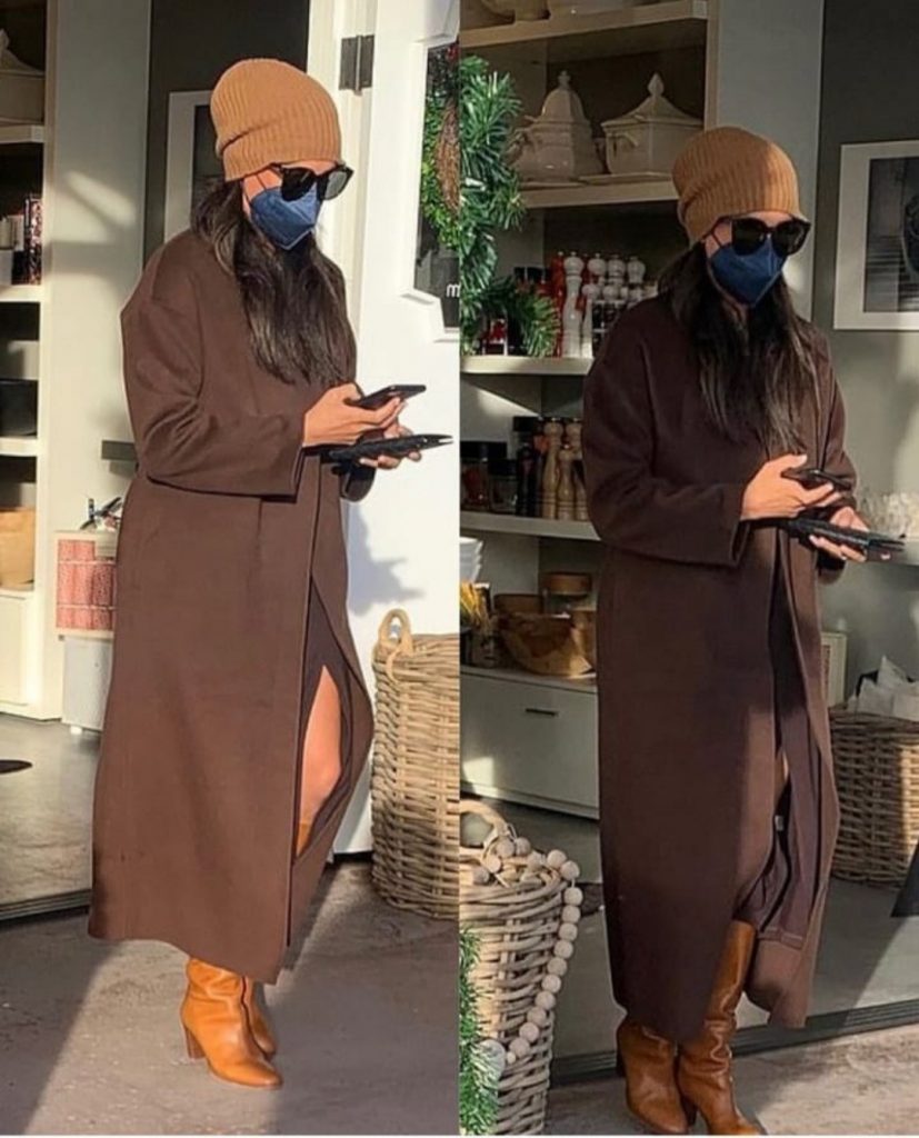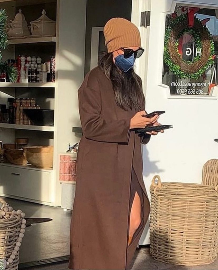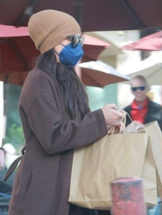 She wore a brown Massimo Dutti wool coat, Tamara Mellon boots, Bottega Veneta clutch, LeSpecs Air Heart sunglasses, along with a brown beanie and blue face mask.