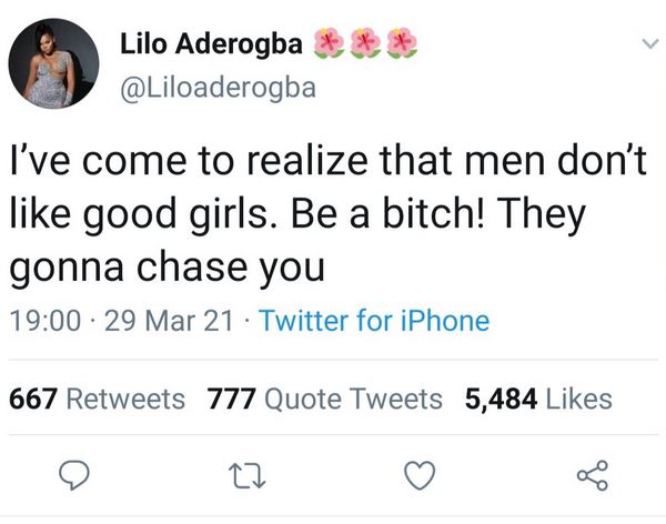 She tweeted: “I’ve come to realize that men don’t like good girls. Be a bitch! They gonna chase you”