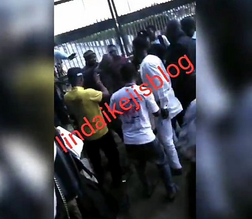 In a video sent to LIB, students can be seen beating a man who sells pure water at Lagos State University (LASU) gate while he was being taken away by police men.