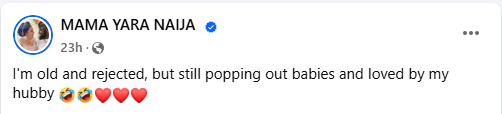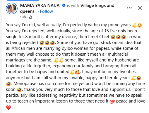 “You say I’m old, well actually, I’m perfectly within my prime years. You say I’m rejected, well actually, since the age of 15 I’ve only been single for 8 months after my divorce, then I met Chief, so who is being rejected,” she wrote in a Facebook post on Monday, April 21.