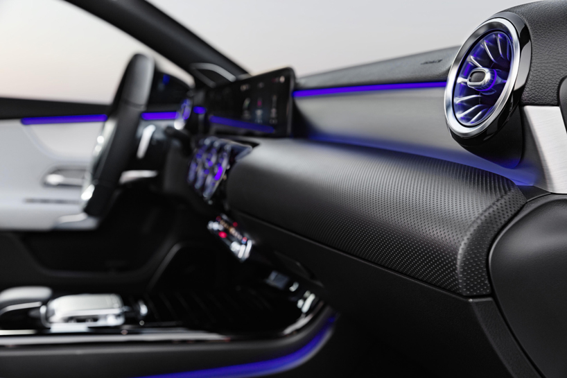 Mercedes has taken a completely new approach, revolutionizing the compact class from the inside with a new feeling of spaciousness. The unique interior architecture is shaped in particular by the avant-garde design of the dashboard. As a result, the ring-shaped main body of the dashboard extends from one front door to the other with no visual discontinuity. the widescreen display is completely free-standing. the air vents in a sporty turbine-look are a visual highlight.