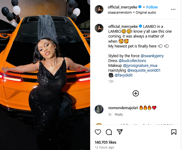 Reality TV star, Mercy Eke, announces the acquisition of a Lamborghini, sparking congratulatory messages from fans and industry colleagues.