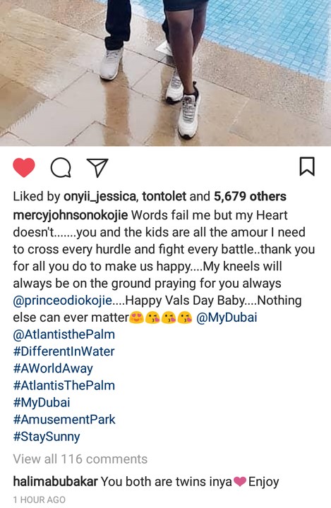 “Words fail me but my Heart doesn’t…….you and the kids are all the amour I need to cross every hurdle and fight every battle..thank you for all you do to make us happy….My kneels will always be on the ground praying for you always @princeodiokojie….Happy Vals Day Baby….Nothing else can ever matter���� @MyDubai”