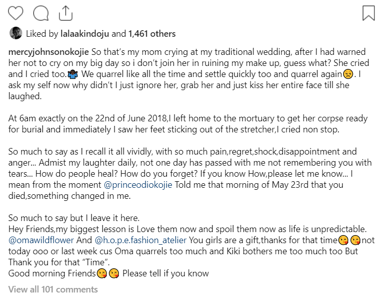 One year after her mum Elizabeth Johnson’s burial, actress Mercy Johnson has taken to Instagram to remember her with an emotional post.