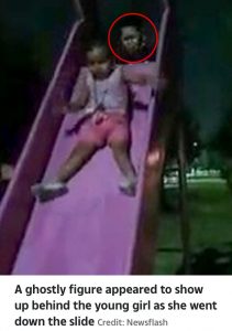 A mum was left horrified after spotting a ghostly figure appearing to push a little girl down a slide – but only noticed when she watched the clip.