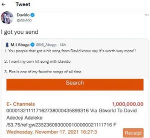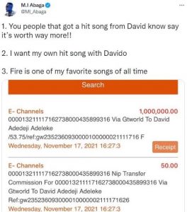 Nigerian rapper, MI took to Twitter to ask singer, Davido for a collaboration after he sent him the sum of IM.