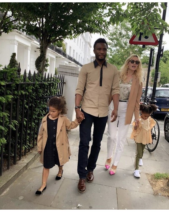 Football star, Mikel Obi with his Russian girlfriend and their twins step out in style for Children’s Day.