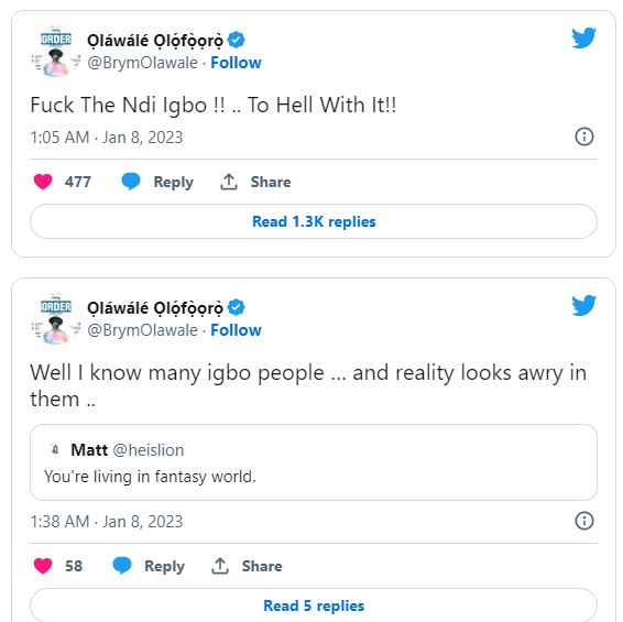 “F**k The Ndi Igbo!! ..To Hell With It!!”. Well I know many Igbo people … and reality looks awry in them..” he wrote.