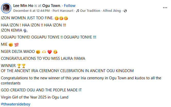 Miss Laura Iyama, has emerged the ‘Virgin Girl of the year at the 2025 ancient Iria ceremony held in Ogu Kingdom, Okirika Local Government Area of Rivers State.
