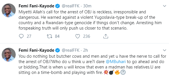 Former Aviation Minister, Femi Fani-Kayode, has taken a swipe at Miyetti Allah for calling for the arrest of former President, Olusegun Obasanjo over the open letter he wrote to President Buhari.
