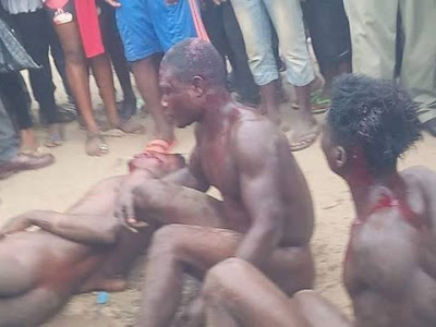 These men were reportedly caught after molesting an 8-year old girl selling pure water at relief market Owerri, Imo state. They were beating mercilessly and paraded n*ked before being handed over to the authorities.