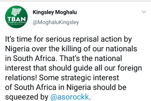 “It’s time for serious reprisal action by Nigeria over the killing of our nationals in South Africa. That’s the national interest that should guide all our foreign relations!