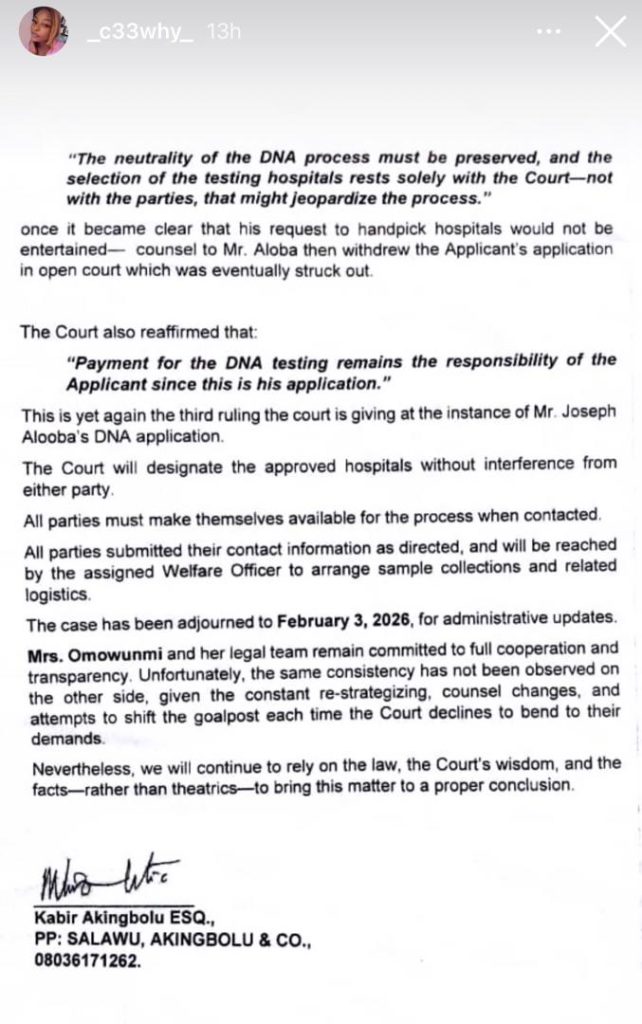 In a statement released on her IG page some hours ago, Wunmi hinted that her father in-law has been the one shifting the goal post, thereby delaying the DNA test to be carried out.