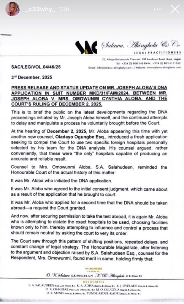 In the statement released by her lawyers, Wunmi mentioned that hearing for the case resumed yesterday with her father in-law applying for an order that the DNA test must be carried out in two hospitals of his choice. Wunmi mentioned that the application was struck out by the court as it insists that the DNA tests must be carried out in a two neutral hospitals where both parties have no interest.