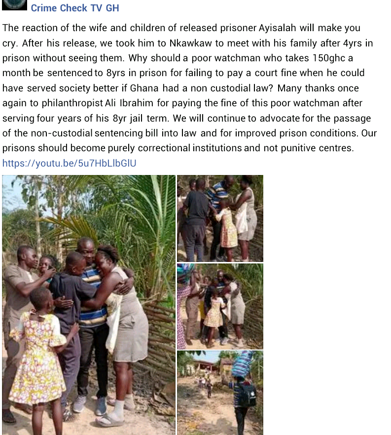 “The reaction of the wife and children of released prisoner Ayisalah will make you cry. After his release, we took him to Nkawkaw to meet with his family after 4yrs in prison without seeing them. Why should a poor watchman who takes 150ghc a month be sentenced to 8yrs in prison for failing to pay a court fine when he could have served society better if Ghana had a non custodial law?