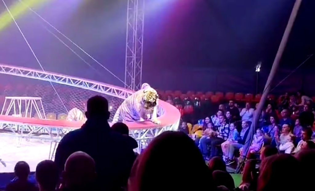 The clip, which has circulated widely online, begins by showing three tigers standing on stools as the ringleader and assistant pace around the stage, with a circular net separating them from the crowd.