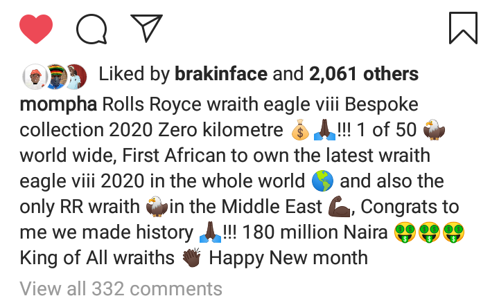 Flamboyant Nigerian businessman, Ismaila Mustapha aka Mompha has bought himself the latest Rolls Royce Wraith Eagle viii 2020 and he claims he’s the first African in the whole world and in the Middle East to buy the luxury whip.