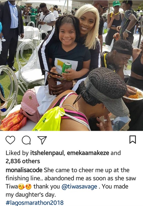 Nollywood actress, Monalisa Chinda has recounted how her daughter who came to cheer her up at the Lagos City Marathon finishing line abandoned her on sighting singer, Tiwa Savage.