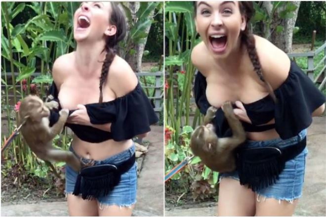 A woman was almost embarrassed by a monkey in Thailand after it hopped on her and playfully pulled down her top, exposing her boobs in the process.