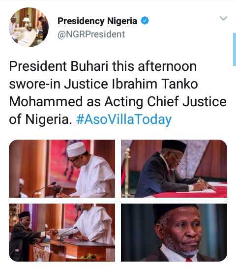 After the suspension of Walter Onnoghen, Presidency released Photos of Buhari swearing in Muhammed Tanko as acting CJN…