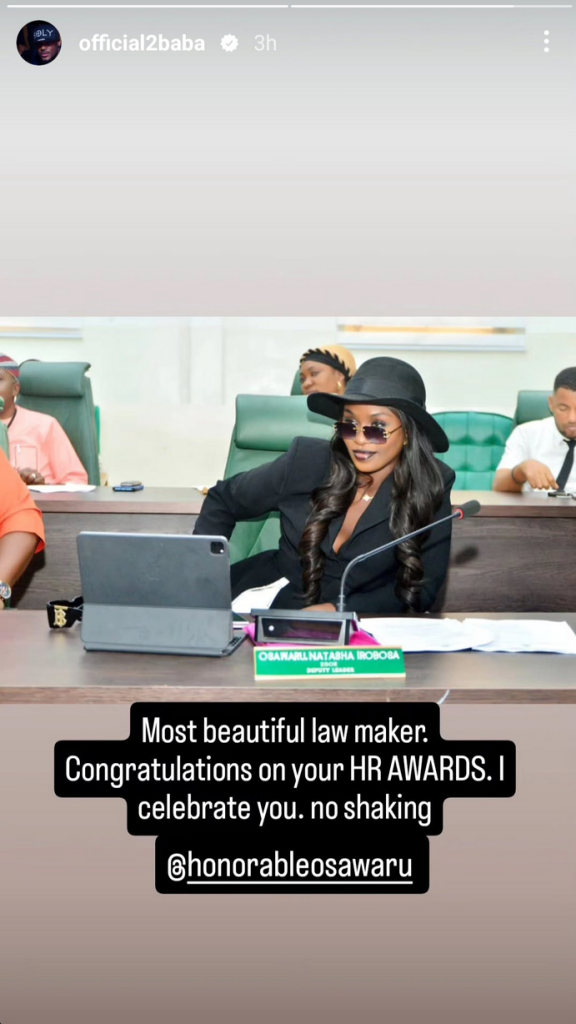 He shared a photo of her and wrote: “Most beautiful lawmaker. Congratulations on your HR Awards. I celebrate you. No shaking.”
