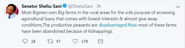 The Senator from the Northern part of Nigeria, Shehu Sani has claimed in a Tweet that most big men who own big farms in the rural part of the country have abandoned their farms as a result of the increasing rate of kidnapping.