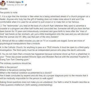 “A popular clergyman, Catholic priest, Fr. Kelvin Ugwu has warned Nigerians that most of the miracles advertised on television and crusades are fake/staged.