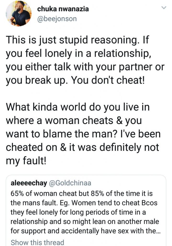 A Twitter user has blamed infidelity among females on men but Twitter users do not agree with her.