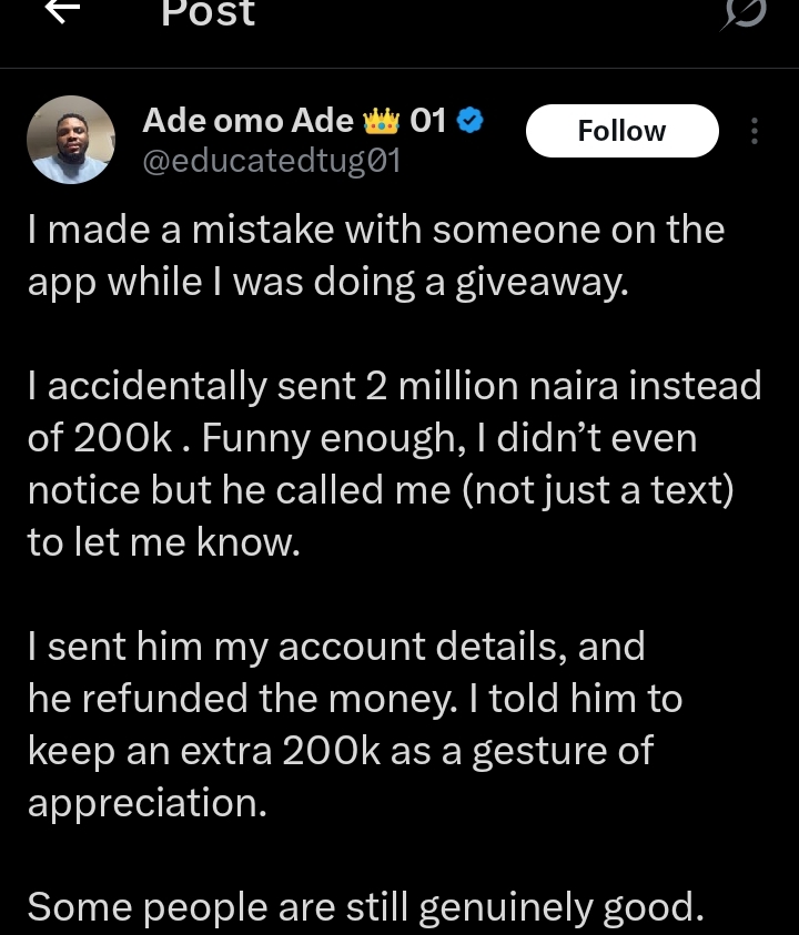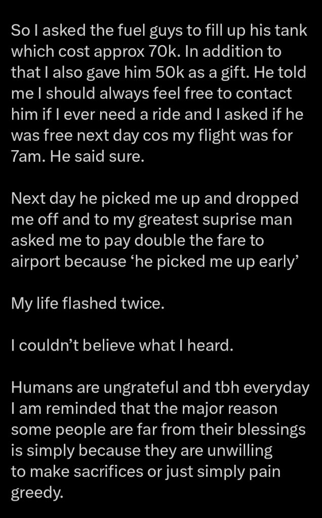 ”So I asked the fuel guys to fill up his tank which cost approx 70k. In addition to that I also gave him 50k as a gift. He told me I should always feel free to contact him if I ever need a ride“, The tweet reads in part.