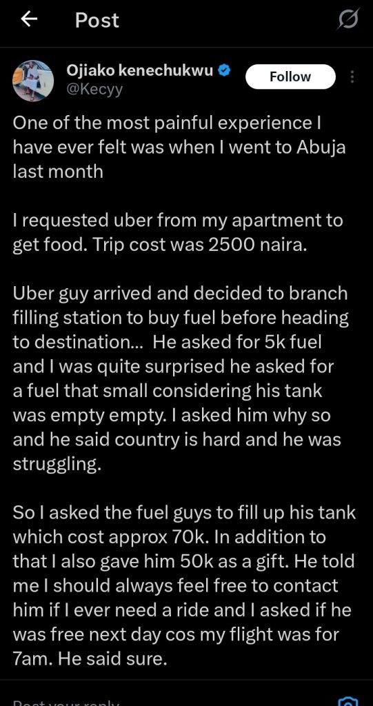 A Nigerian man’s encounter with an Uber driver has left netizens in disbelief despite filling up the driver’s tank.