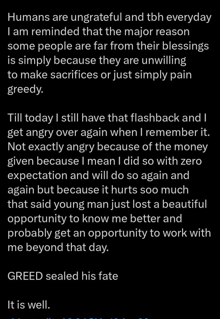 ”Till today I still have that flashback and I get angry over again when I remember it. Not exactly angry because of the money. That said young man just lost a beautiful opportunity to know me better and probably get an opportunity to work with me beyond that day”, He added.