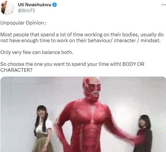 Nollywood actor/TV host, Uti Nwachukwu has opined that most people that spend a lot of time working on their bodies usually do not have enough time to work on their behavior, character, or mindset.