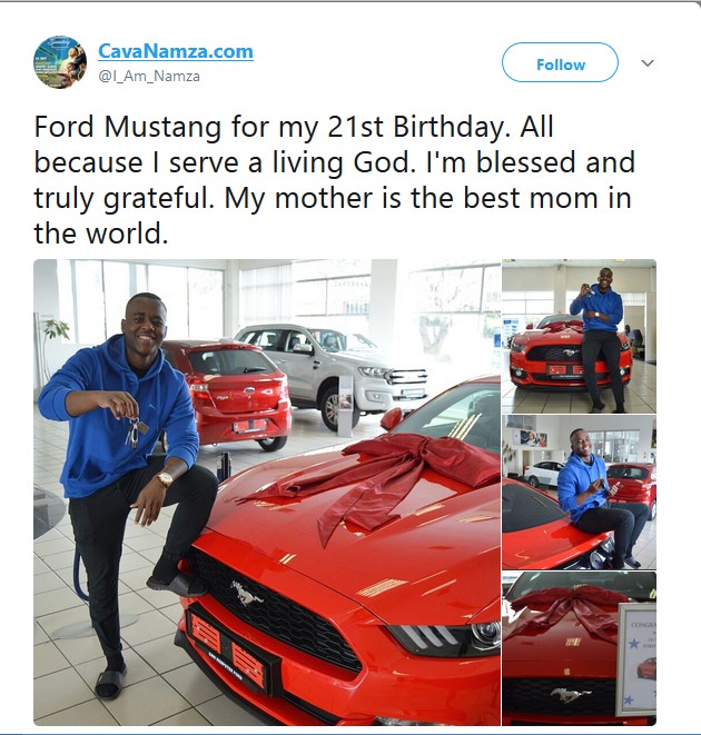 A young man got a Ford Mustang from his mother for his 21st birthday. The guy who apparently couldn’t control his excitement took to his twitter account to share photos of the new ride with the caption; Ford Mustang for my 21st Birthday. All because I serve a living God. I’m blessed and truly grateful. My mother is the best mom in the world.