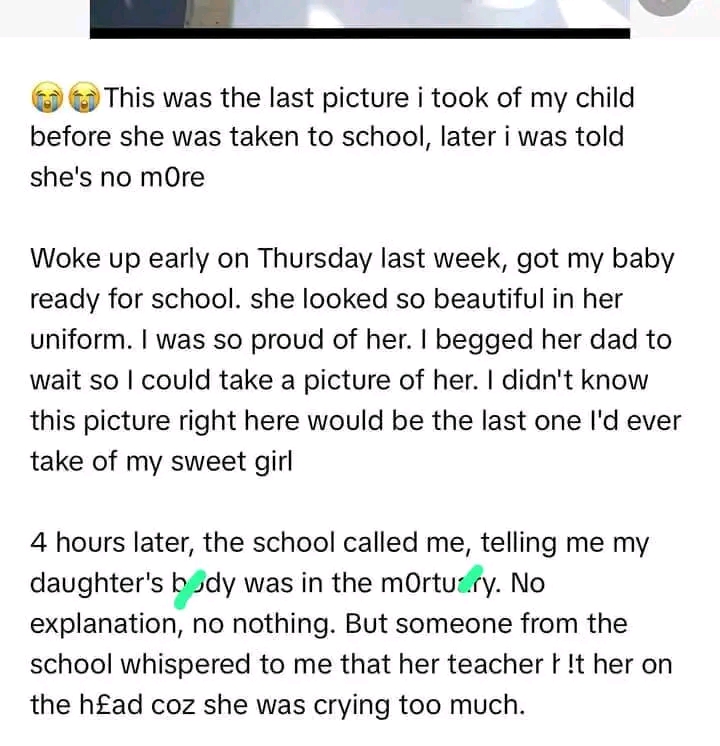 Her post reads,“This was the last picture I took of my child before she was taken to school. Later I was told she’s no more. 4 hours later, the school called me telling me my daughter’s body is in the moturary. But someone at the school told me that her teacher hit her on the bead because she was crying too much “.