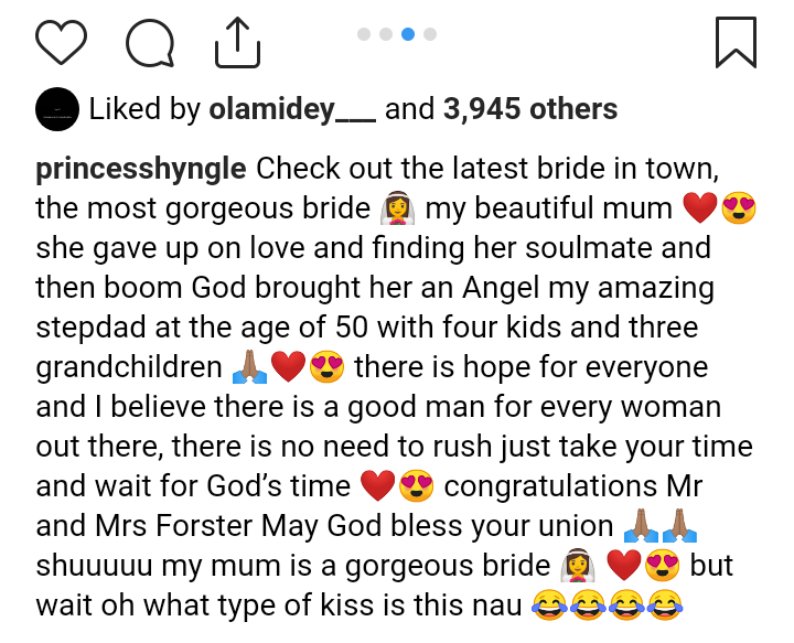 Check out the latest bride in town, the most gorgeous bride my beautiful mum she gave up on love and finding her soulmate and then boom God brought her an Angel my amazing stepdad at the age of 50 with four kids and three grandchildren there is hope for everyone and I believe there is a good man for every woman out there, there is no need to rush just take your time and wait for God’s time congratulations Mr and Mrs Forster May God bless your union shuuuuu my mum is a gorgeous bride but wait oh what type of kiss is this nau