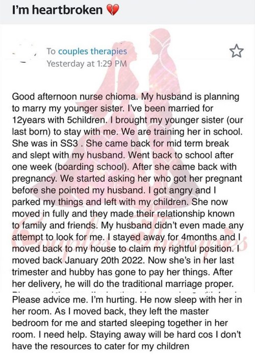 “Good afternoon nurse chioma. My husband is planning to marry my younger sister. I’ve been married for 12years with 5children. I brought my younger sister (our last born) to stay with me.