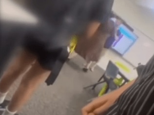 Shocking video obtained by 7News shows the furious mum’s obscene and threatening tirade inside a classroom at St Paul’s College in Adelaide, Australia, on Monday afternoon, Feb. 3.